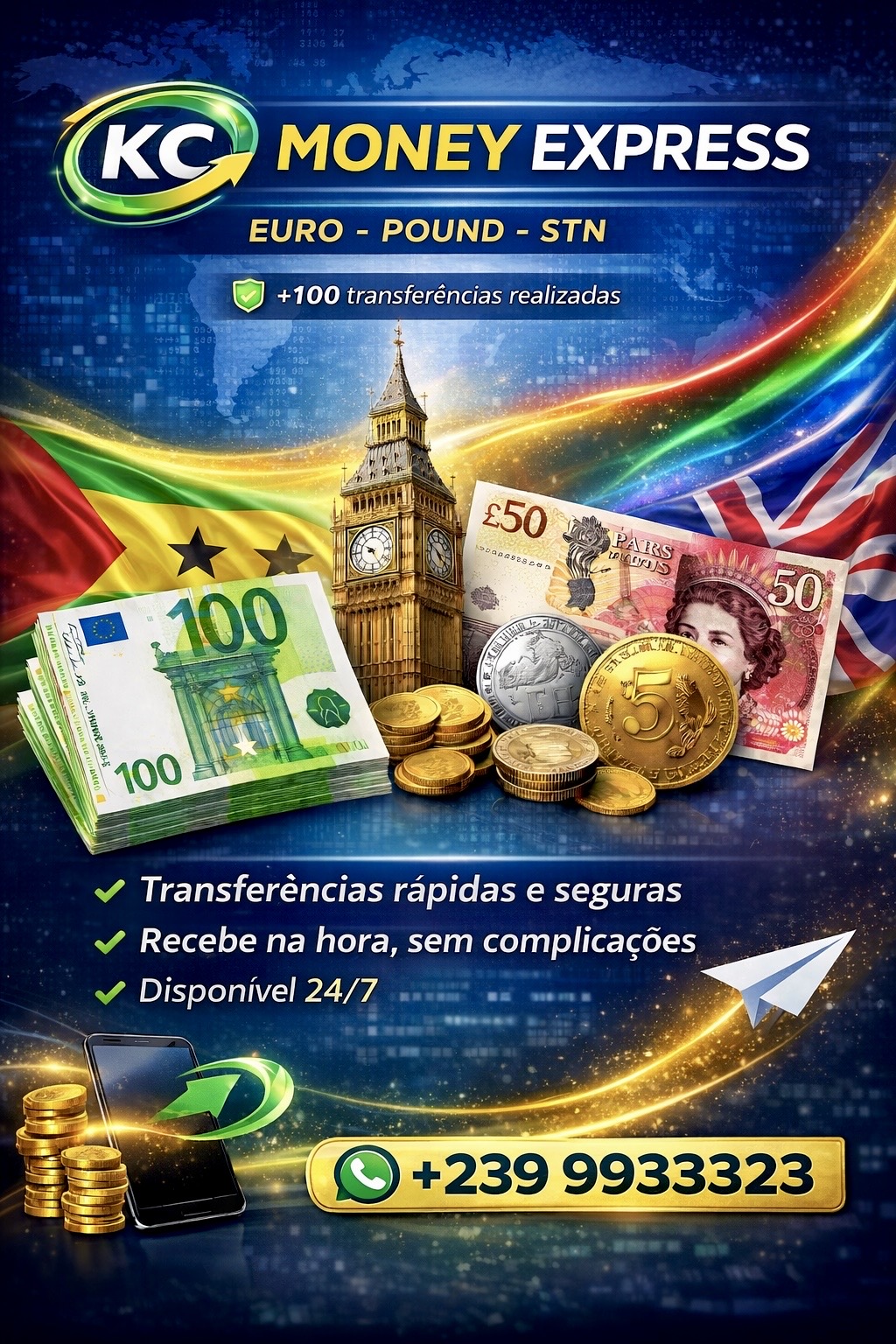 Transferências rápidas, seguras e com as melhores taxas de câmbio. Receba em minutos via WhatsApp.